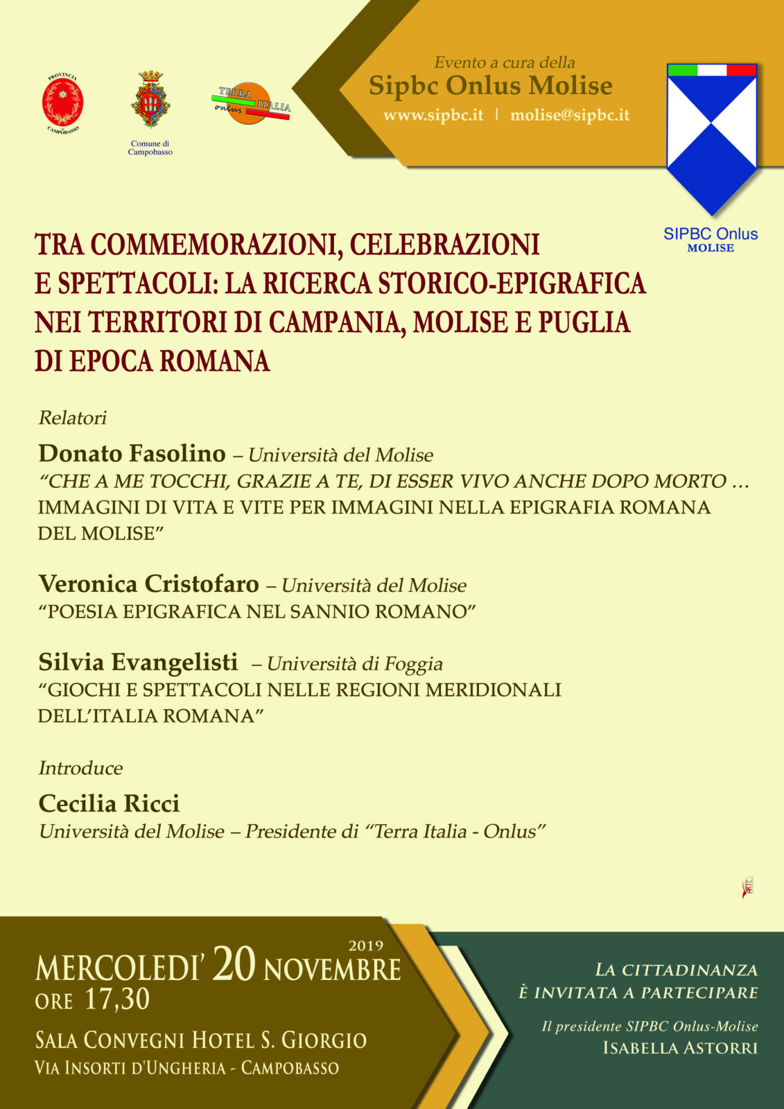 Per tutti loro, come per altri studiosi, giovani e meno giovani, con diverse linee di ricerca (archeologiche, storico-artistiche, antropologiche…) preziose sono le opportunità che da tanti anni la Presidente Astorri e la SIPC ONLUS – MOLISE offrono per proporre nuove riflessioni e i frutti, anche se provvisori, del loro lavoro a tutti coloro che nel pubblico e nel privato mantengono viva l’attenzione e la sensibilità ai temi della cultura, della sua valorizzazione e tutela.