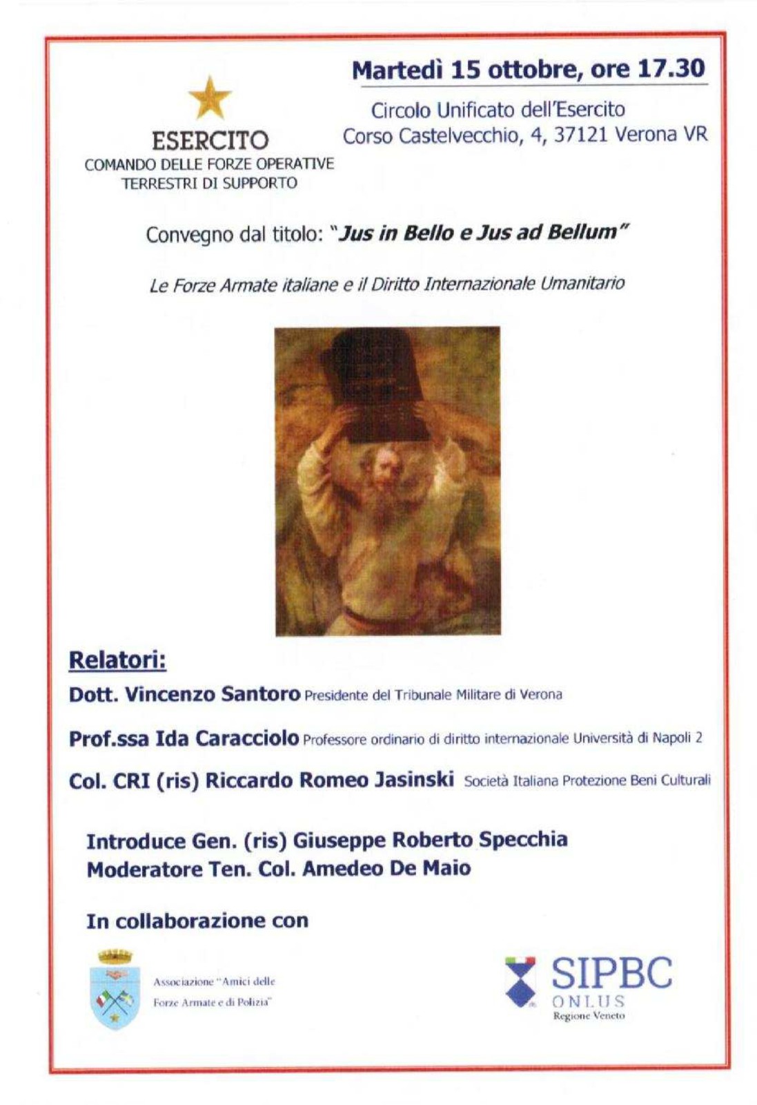 Nella meravigliosa cornice di Castelvecchio in Verona, sede del Circolo Unificato, avrà luogo il 15 ottobre 2019 alle ore 17:30 la conferenza  dal titolo: ”Jus in bello e Jus ad Bellum”, sottotitolo: Le Forze Armate italiane e il Diritto Internazionale Umanitario.