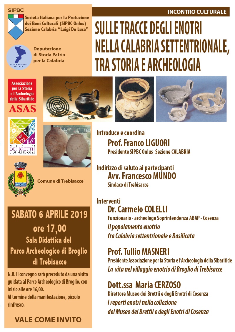 SABATO 6 APRILE p.v. (ore 17,00), riprende l’attività della SIPBC calabrese, con un importante incontro culturale in tema di storia e archeologia della nostra regione, organizzato in collaborazione con l’Associazione per la Storia e l’Archeologia della Sibaritide e col patrocinio della Deputazione di Storia Patria per la Calabria e del Museo dei Brettii e degli Enotri di Cosenza. Il tema del convegno è il seguente: